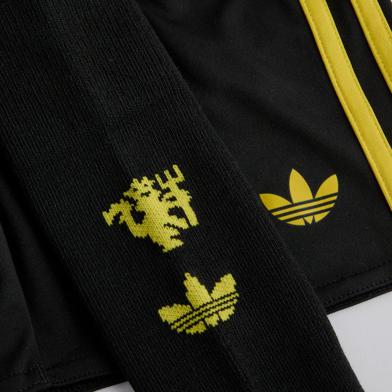 Part of a clean, classic kit that will transport fans to a golden era. Finished in black, this Manchester United third jersey for juniors conjures some of the club's most iconic players and memorable away performances. A yellow Trefoil and club badge stand out on the chest while more subtle, devilish details are woven into the fabric. Moisture-managing AEROREADYkeeps young fans comfortable while their team create new memories.